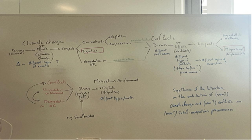 Fig 1: A whiteboard snapshot showing the climate-conflict-migration synthesis framework (conceptualised by Christophe Béné), adopted by the team during the first in-person workshop in Cape Town (April 2025).